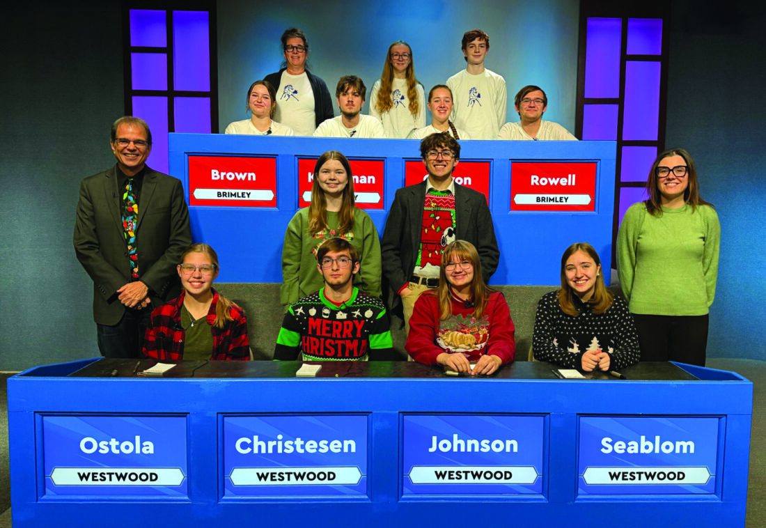 Westwood played Brimley in High School Bowl and was defeated by a score of 120-240. Brimley will advance to the second round when they play Holy Name, scheduled to air on Feb. 7. Running from November through the championship game in April, the High School Bowl series airs on WNMU-TV Saturdays at 8 p.m. and Mondays at 3 p.m. It is also available statewide on the Michigan Learning Channel. Find more information on the 2025-2026 tournament at wnmutv.nmu.edu. Representing Westwood are, from left, are Evynn Seablom, Maggie Johnson, team captain Caleb Christesen and Lucy Ostola. Standing are alternates Quinn Saunders and Nathan Gray with coach Cara Anderson. Players for Brimley, seated left, are Cameron Brown, Dylan Kabelman, team captain Hazel Garvon and Alex Rowell. Standing are alternates Asher Fleming and Scarlette Garvon with coach Peggy Osborne. High School Bowl host Jim Koski is standing at lower left. (Courtesy photo)