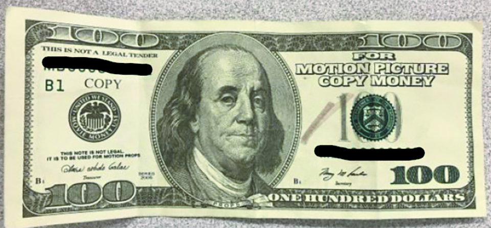 This is a photo of a prop $100 bill that is often used in motion pictures or television shows. Several of the fake bills have been used and recovered in the Alpena area recently. (Courtesy photo)