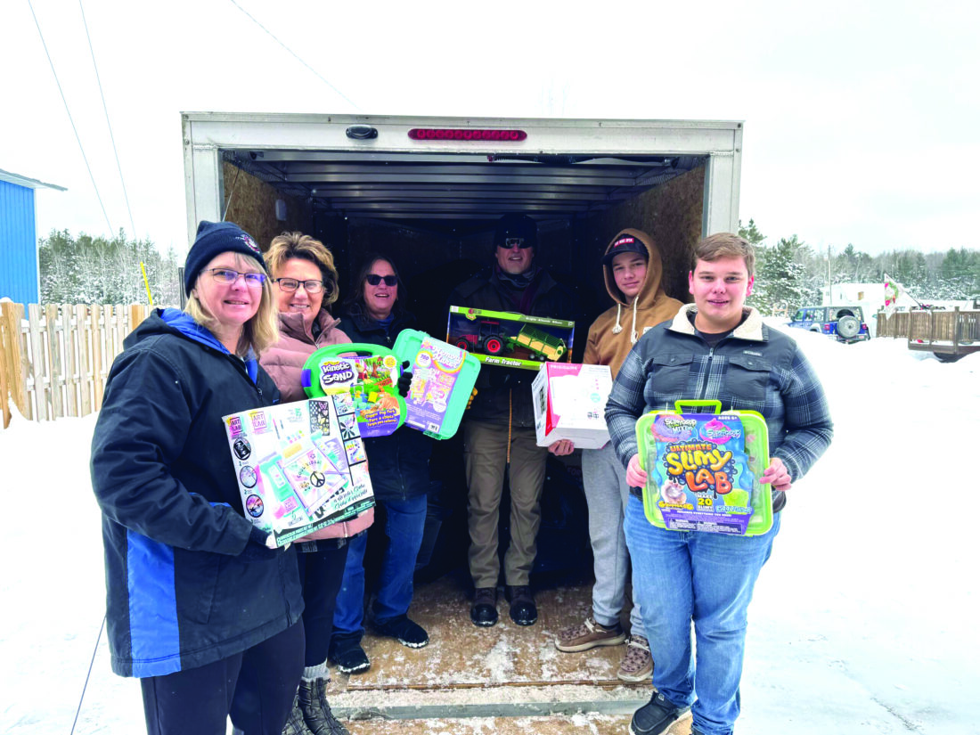 Recently, Lake Superior Detachment 764 of the Marine Corps League in running its 2025 Toys For Tots campaign donated a trailer full of toys to the Gwinn St Vincent de Paul agency for its Christmas toy distribution. Pictured, from left, are Tracey Tippett (Toys for Tots coordinator) Michelle Zaboroske, Brenda Tregembo, Gerry Zaboroske, Logan and Noah Tregembo (helpers). (Courtesy photo)