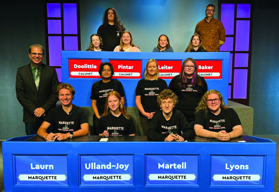 Marquette played Calumet in High School Bowl and won by a score of 330-50. Thirty-six schools from the Upper Peninsula and Northern Wisconsin field teams for WNMU-TV's High School Bowl tournament, now celebrating 47 years on the air. Marquette will advance to the second round when they play Sault Ste. Marie, scheduled to air on Feb. 7. Representing Marquette are, from left, Nick Lyons, Ethan Martell, team captain Esme Ulland-Joy, and Caden Laurn. Standing are alternates Lorelai Williams and Margarita Villarello with coach Krystyna Rickauer. Players for Calumet, seated from left, are players Emelea Doolittle, Laci Pintar, team captain Adelyn Leiter, and Naomi Baker. Standing are alternate Christian Brewer and coach David Torola. High School Bowl host Jim Koski is standing at lower left. (Courtesy photo)