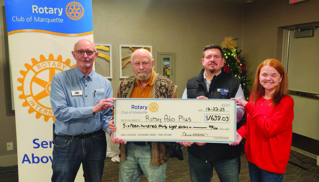 Three Rotary clubs in Marquette County celebrated the success of October's Pumpkins Against Polio event. The combined effort of the Rotary Club of Marquette, the Marquette Harbor Rotary Club and the Ishpeming Rotary Club raised $1,638.03. With the 2-1 match from the Gates Foundation, $4,924.03 was raised to stop polio now effort of Rotary International. Polio has been eliminated in all but two countries at this time. Pictured here, from left, are Chuck Blaksmith, Rotary Club of Marquette; Jim Cantrill, president of the Marquette Harbor Rotary; Paul Cromell, event chairperson; and Emily Rushford, president elect of the Ishpeming Rotary Club. (Courtesy photo)