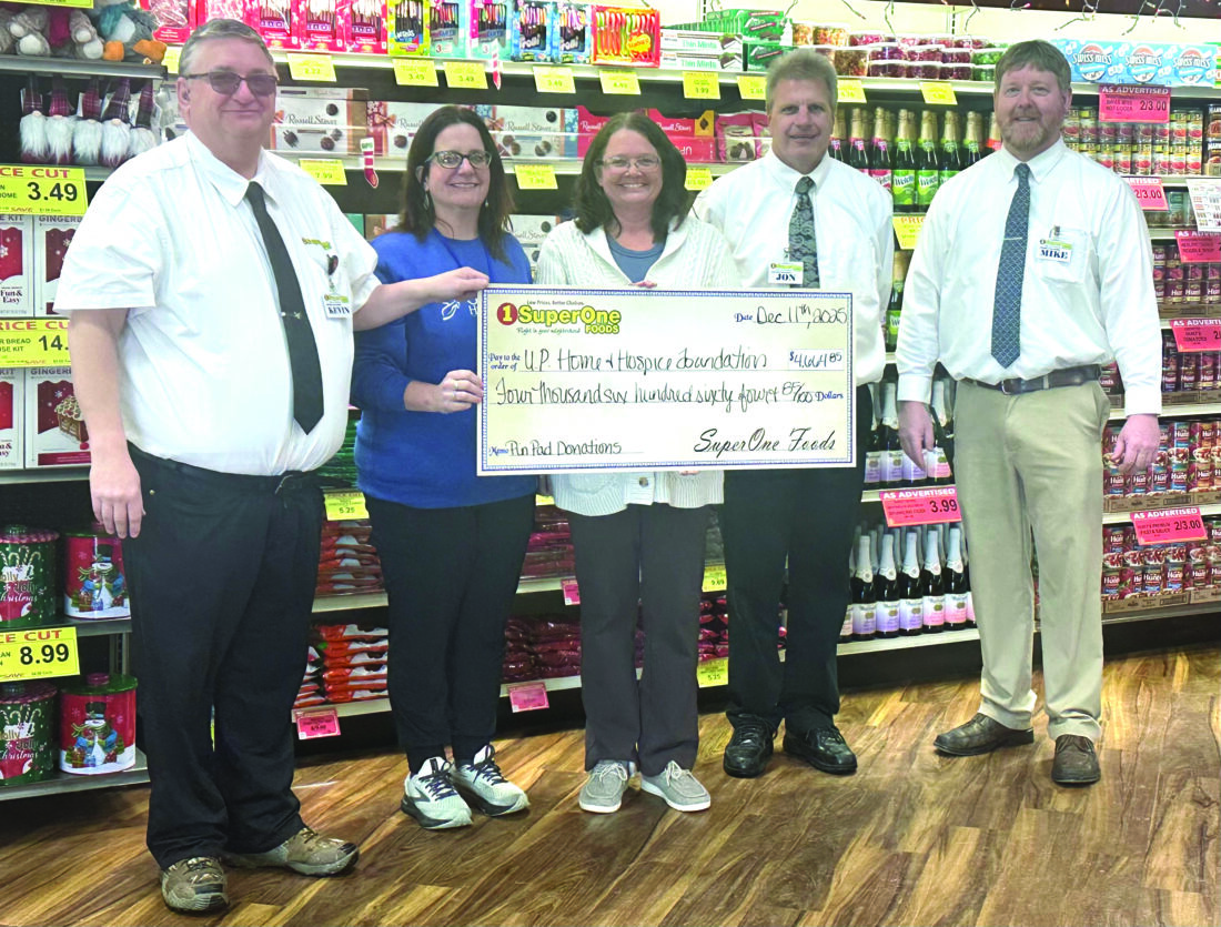The generous customers of Super One Foods in Marquette Township and Negaunee donated $4,664.85 through pin pad donations during our fundraising campaign for the U.P. Hospice Foundation. Pictured, from left, are Kevin Champion, Kori Bjorne, Jennie Garret-Bureau, Jon Revier and Mike LaVigne. (Courtesy photo)