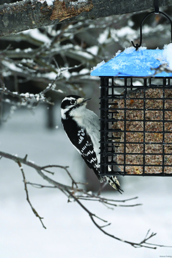 A female downy woodpecker grabs a little dinner in Ely Township on Monday. (Photo courtesy of Victoria Frailing Photography)