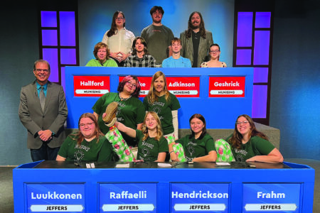 Munising played Jeffers in High School Bowl and won by a score of 250-220. Thirty-six schools from the Upper Peninsula and Northern Wisconsin compete in WNMU-TV's High School Bowl tournament, now celebrating 47 years on the air. Jeffers will advance to the second round when they play Ironwood, scheduled to air on March 21. Running from November through the championship game in April, the High School Bowl series airs on WNMU-TV Saturdays at 8 p.m. and Mondays at 3 p.m. It is also available statewide on the Michigan Learning Channel. Representing Munising, seated from left, are players Braeden Hallford, Ben Dryke, team captain Dylan Adkinson and Grace Geshrick. Standing are alternates Will Wilson and Levi Westcomb with coach Eric Lynch. Players for Jeffers are, seated from left, Naomi Frahm, Savannah Hendrickson, team captain Pearl Raffaelli and Kristin Luukkonen. Standing are alternates Arabella Perala and with coach Emily Raffaelli. High School Bowl host Jim Koski is standing at lower left. (Courtesy photo)