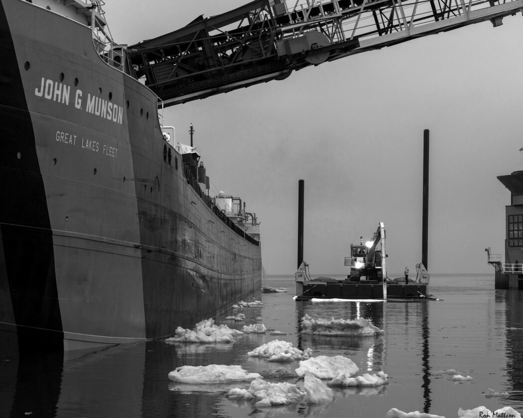 Lake freighter John G. Munson is pictured receiving a deposit of iron ore while harbor maintenance does it work at Marquette's Upper Harbor (Presque Isle) ore dock Wednesday. (Photo courtesy of Ron Mattson)