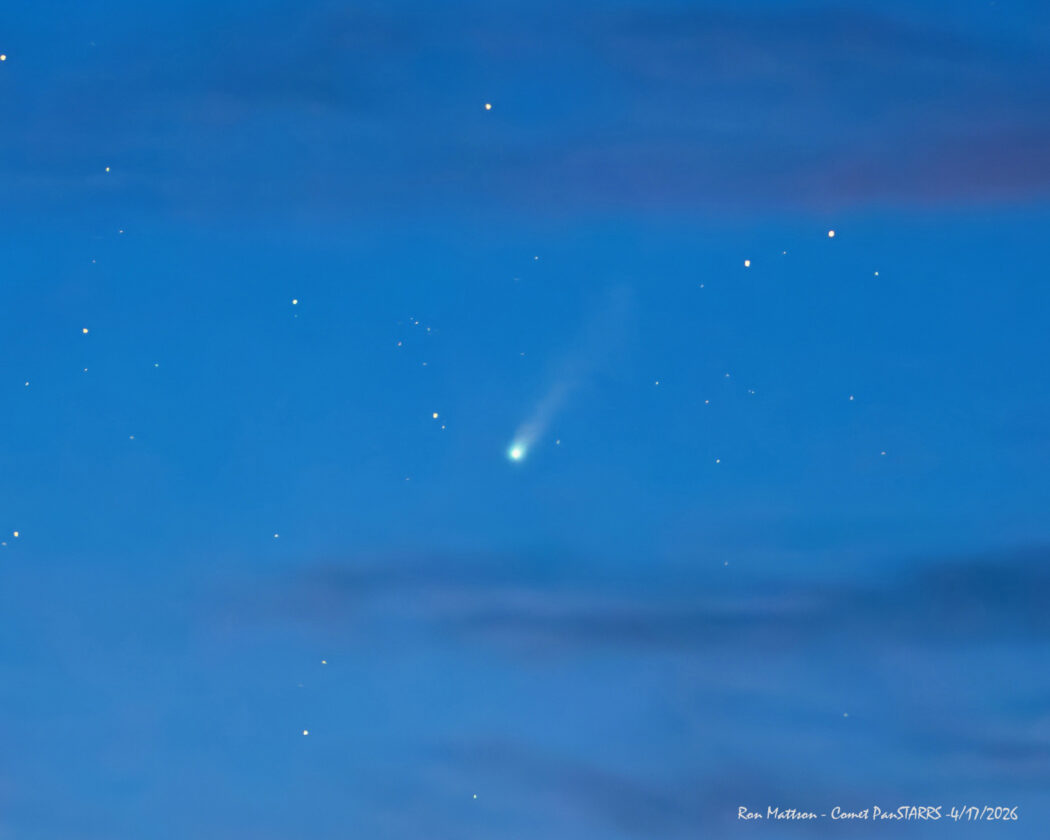 Comet C/2025 R3 PanSTARRS is captured streaking across the heavens on Friday. The comet is what's known as a long-period comet, currently passing through the inner solar system, having reached perihelion (closest approach to the Sun) on Sunday. It was discovered in September and is projected to make its closest approach to Earth next Sunday, April 26. (Photo courtesy of Ron Mattson)