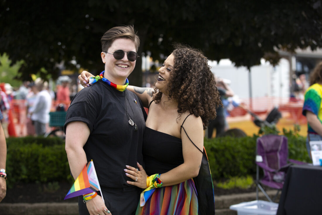 Sarina Bee, right, and wife, Mack pose for a portrait during Grand Haven Pride Fest in Grand Haven, Mich., on Saturday, June 10, 2023. The festival — which organizers had hoped would attract at least 500 attendees — drew thousands of people from all over who came to experience the first-time event's drag show, dance party and vendor-filled streets. (AP Photo/Kristen Norman)