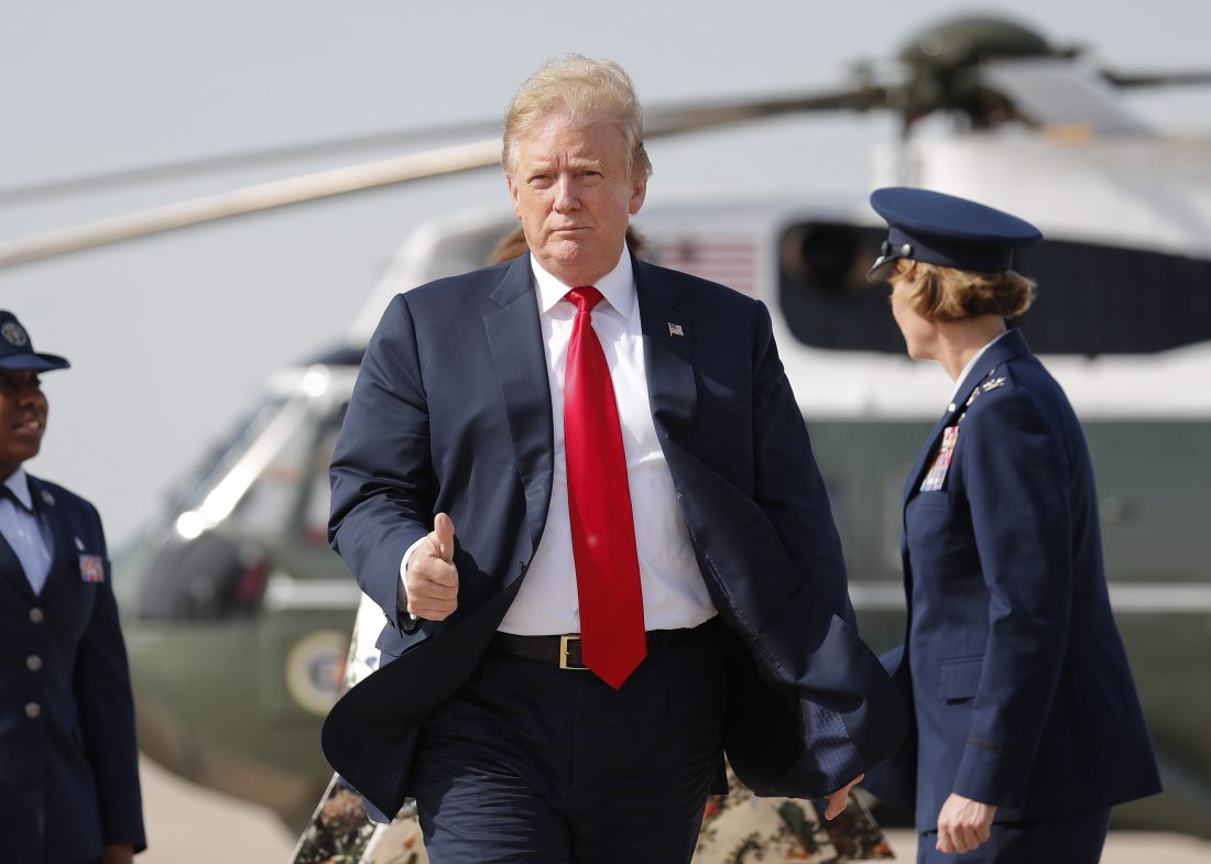 - President Donald Trump gives a ‘thumbs-up’ as he prepares to board Air Force One, Thursday, April 18, 2019, at Andrews Air Force Base, Md. President Trump is traveling to his Mar-a-lago estate to spend the Easter weekend in Palm Beach, Fla. (AP Photo/Pablo Martinez Monsivais)