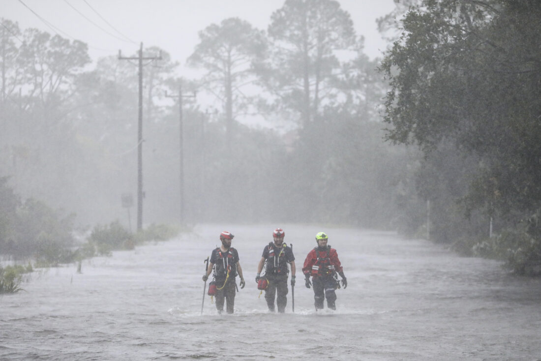 Rescue workers with Tidewater Disaster Response wade through a tidal surge on SW 358 Highway while looking for people in need of help after the Steinhatchee River flooded on Wednesday in Steinhatchee, Fla., following the arrival of Hurricane Idalia. (AP photo)
