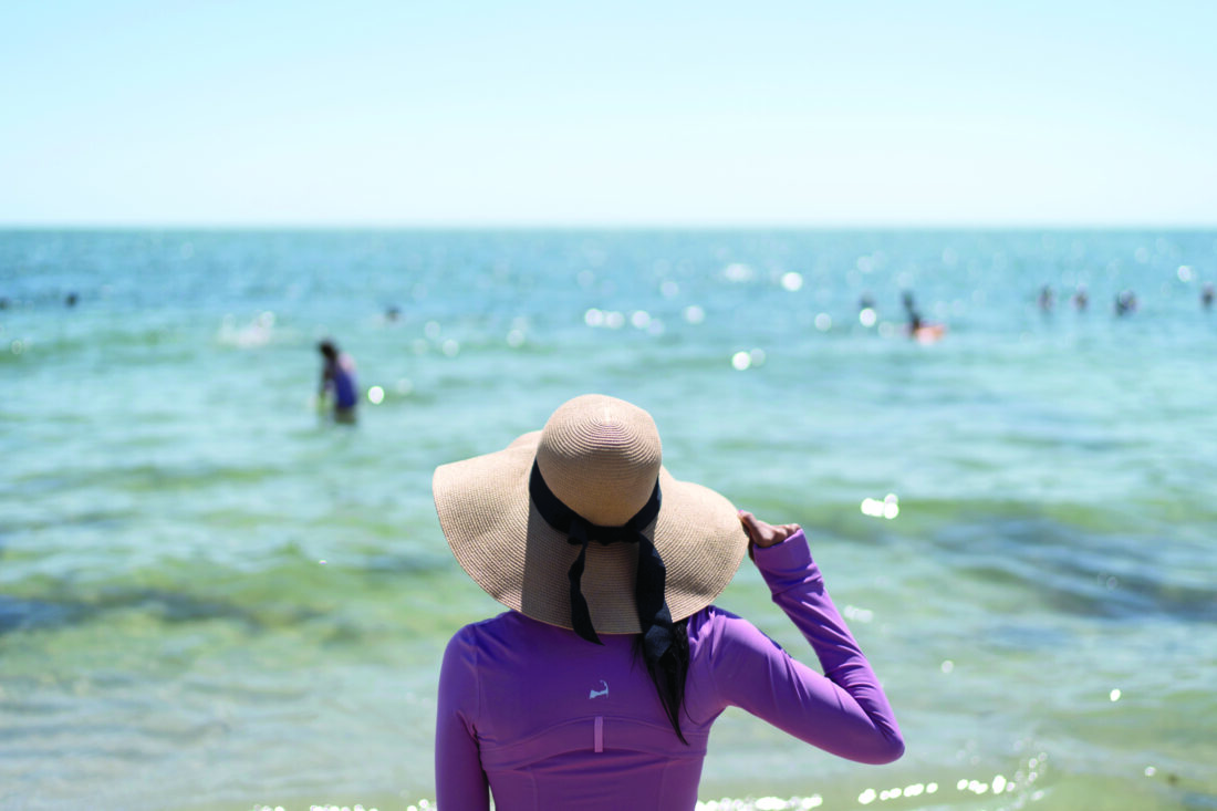 Ruth Wilson, who has lupus and is sensitive to the sun, stands at the water's edge while at the beach with family on Aug. 16 in South Yarmouth, Mass. (AP photo)