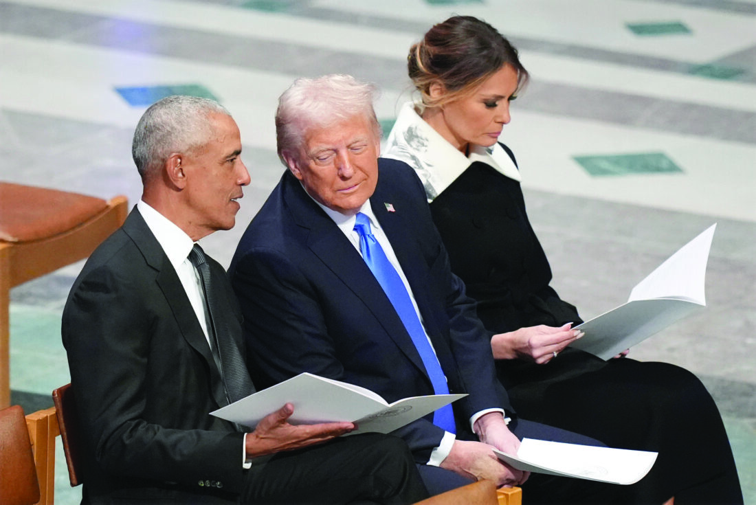 Former President Barack Obama talks with then President-elect Donald Trump as Melania Trump reads the funeral program before the state funeral for former President Jimmy Carter at Washington National Cathedral in Washington on Jan. 9, 2025. (AP photo)