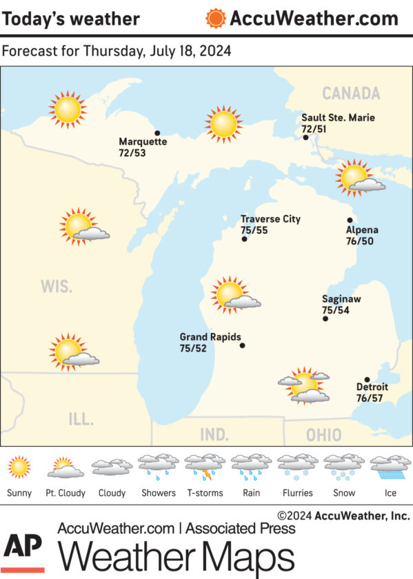 Marquette and vicinity: Today, sunny, with a high near 72. Northwest wind 5 to 10 mph becoming northeast in the afternoon. Tonight, mostly clear, with a low around 55. Light and variable wind becoming southwest 5 to 10 mph in the evening.
