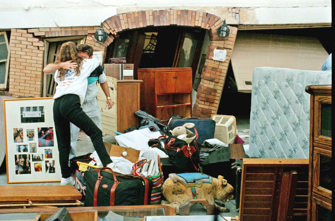 An unidentified couple hug each other as they stand amid their belongings outside an earthquake-damaged home in the Marina district of San Francisco, Oct. 20, 1989. Residents were given 15 minutes to collect valuables from homes deemed unsafe. (AP photo/Rusty Kennedy)