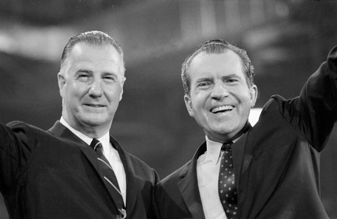 Richard M. Nixon waves to Republican National Convention delegates as he stands with his running mate Gov. of Maryland, Spiro T. Agnew in Miami, Aug. 8, 1968, after accepting the party's nomination as a presidential candidate. (AP photo)