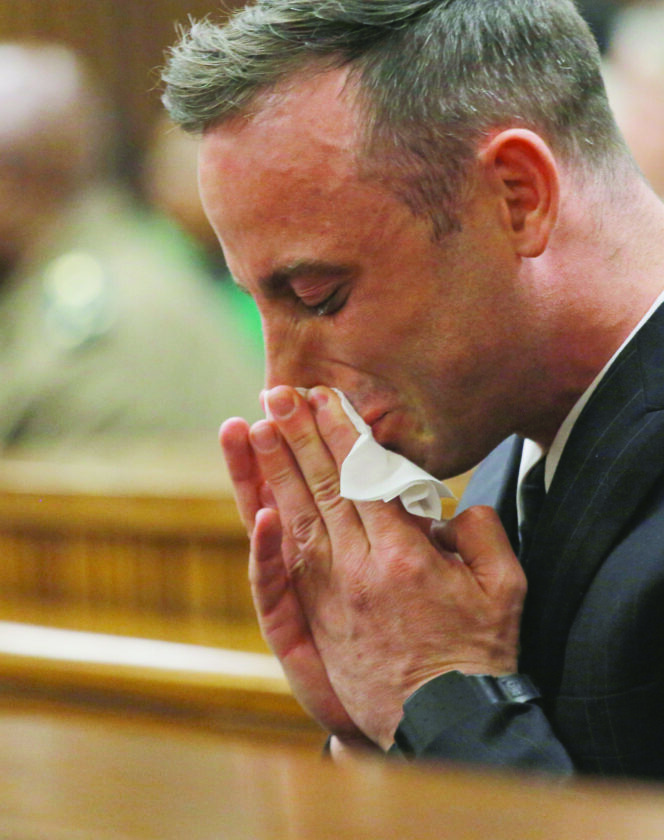 Oscar Pistorius wipes his face as he appears in the High Court in Pretoria, South Africa on the second day of his sentencing hearing for murdering girlfriend Reeva Steenkamp. (AP photo)