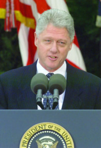 President Clinton makes a statement in the Rose Garden at the White House on Feb. 12, 1999, after the Senate voted to acquit him of perjury and obstruction of justice charges, ending a 13-month drama that catapulted an affair with a White House intern into only the second presidential impeachment trial in history. Permitted to finish his term, the 42nd president declared he was "profoundly sorry ... for what I said and did." (AP photo)