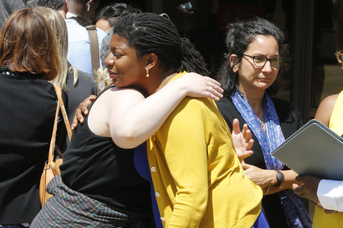 Victims of the 2017 car attack by James Alex Fields Jr., hug outside court after his sentencing in Charlottesville, Va., Friday, June 28, 2019. Fields was sentenced to life in prison for his role in a car attack during a white supremacist rally in 2017. (AP Photo/Steve Helber)