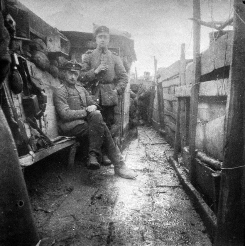 In this photo taken from an image in the collection at In Flanders Fields Museum provided by the family of German soldier Kurt Zehmisch, German World War I soldiers of the 103rd Saxon Regiment sit in their trenches along the Western Front in Warneton, Belgium, during Dec. 1914. Soldiers who had been killing each other by the tens of thousands for months climbed out of their soggy trenches to seek a shred of humanity amid the horrors of World War I. Hands reached out across the divide and in Flanders Fields a century ago, a spontaneous Christmas truce ever so briefly lifted the human spirit. (AP Photo/Virginia Mayo)