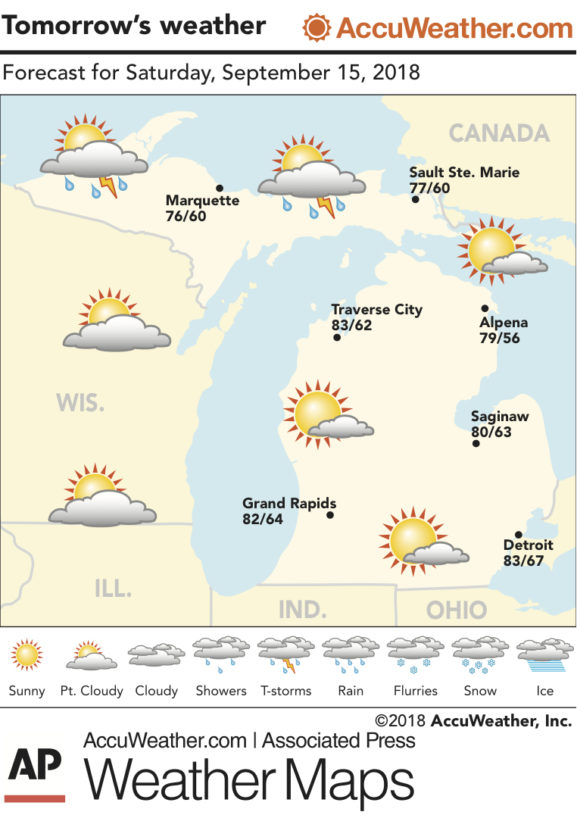 Marquette and vicinity: Tonight, a 20 percent chance of showers and thunderstorms overnight. Mostly cloudy. Lows around 61. Light winds. Saturday, mostly cloudy with a 40 percent chance of showers and thunderstorms. Highs around 77. South winds 5 to 10 mph. Saturday night, a 20 percent chance of showers and thunderstorms in the evening. Partly cloudy. Lows around 62. South winds 5 to 10 mph.