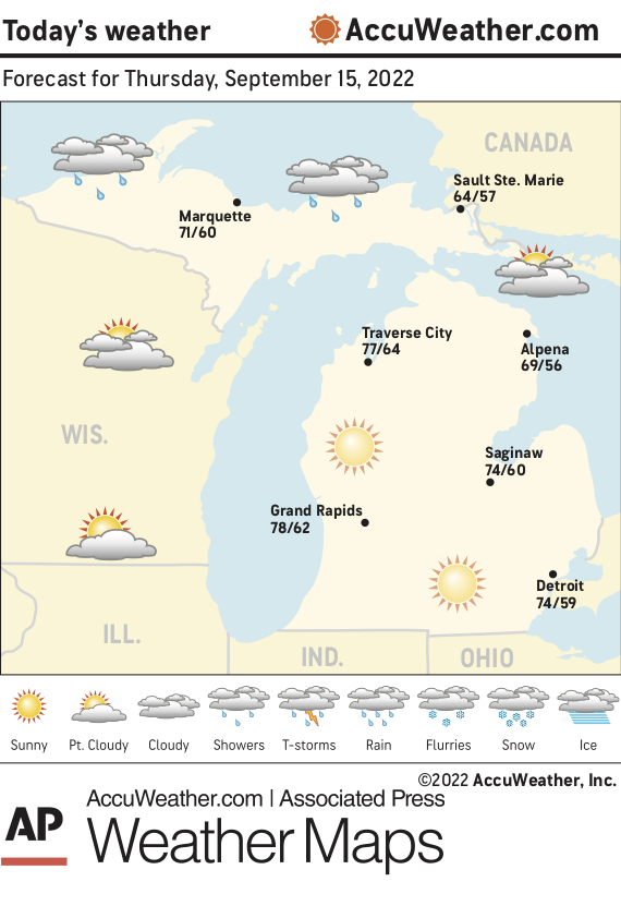 Marquette and vicinity: Today, warmer. A slight chance of rain showers in the afternoon. Mostly cloudy. Highs around 71. South winds 5 to15 mph with gusts up to 25 mph. Chance of rain 20 percent. Tonight, mostly cloudy with a chance of showers with a slight chance of thunderstorms. Lows around 58. South winds 5 to 10 mph with gusts up to 20 mph, becoming southwest after midnight. Chance of rain 40 percent. Friday, mostly cloudy with a slight chance of thunderstorms. A chance of showers in the morning, then showers likely in the afternoon. Highs 69 to 74. South winds 5 to 10 mph. Chance of rain 70 percent.