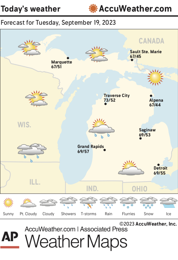 Marquette and vicinity: Today, mostly sunny, with a high near 68. South wind 5 to 10 mph. Tonight, partly cloudy, with a low around 52. South wind around 10 mph.