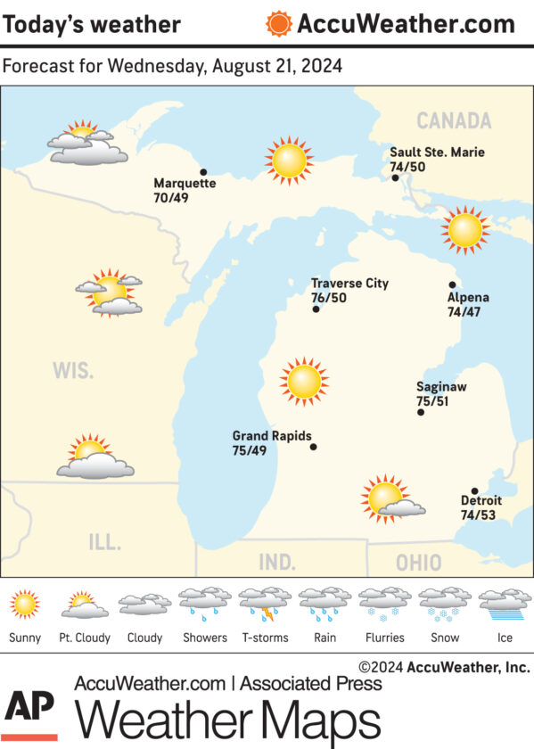 Marquette and vicinity: Today, sunny, with a high near 72. Calm wind becoming northeast around 5 mph in the afternoon. Tonight, mostly clear, with a low around 55. Calm wind becoming southwest around 5 mph after midnight.