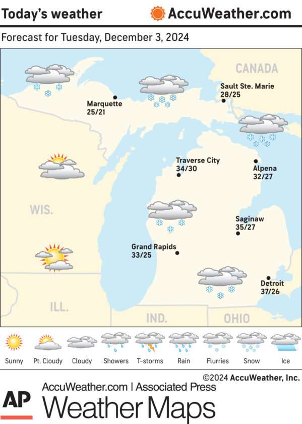 Marquette and vicinity: Today, a slight chance of snow showers before 10am, then a chance of snow showers after 11am. Cloudy, with a high near 28. West wind around 10 mph. Chance of precipitation is 30%. Tonight, snow showers, mainly before 3am. Low around 23. Southwest wind around 15 mph, with gusts as high as 25 mph. Chance of precipitation is 80%. New snow accumulation of 1 to 2 inches possible.