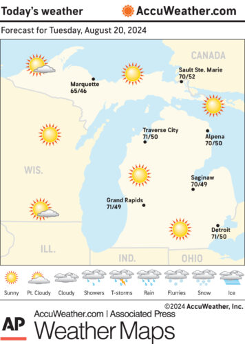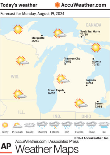 Marquette and vicinity: Today, sunny, with a high near 72. Calm wind becoming northeast around 5 mph in the afternoon. Tonight, mostly clear, with a low around 55. Calm wind becoming southwest around 5 mph after midnight.