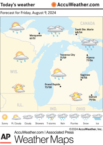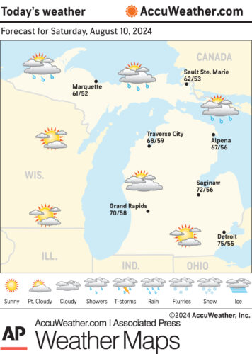 Marquette and vicinity: Today, sunny, with a high near 75. Northwest wind around 5 mph becoming northeast in the afternoon. Tonight, mostly clear, with a low around 60. Calm wind.