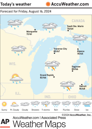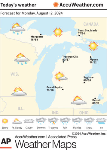Marquette and vicinity: Today, sunny with a high near 78. Light and variable wind becoming east 5 to 10 mph in the afternoon. Tonight, mostly clear, with a low around 61. East wind around 5 mph becoming calm in the evening.