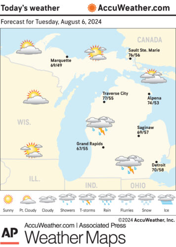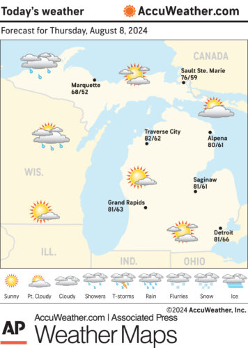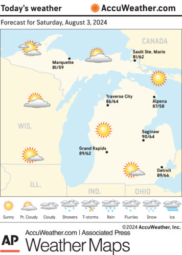 Marquette and vicinity: Today, sunny, with a high near 82. Northwest wind 5 to 10 mph becoming north in the afternoon. Tonight, clear, with a low around 62. Northwest wind around 5 mph.