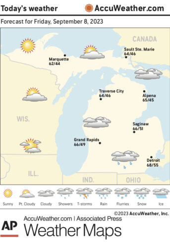Marquette and vicinity: Today, a 20 % chance of showers after 1 p.m. Mostly sunny, with a high near 65. Southwest wind 5 to 10 mph becoming north in the afternoon. Tonight, a 20% chance of showers before 9 p.m. Partly cloudy, with a low around 52. Northwest wind 5 to 10 mph. Sunday, a slight ...