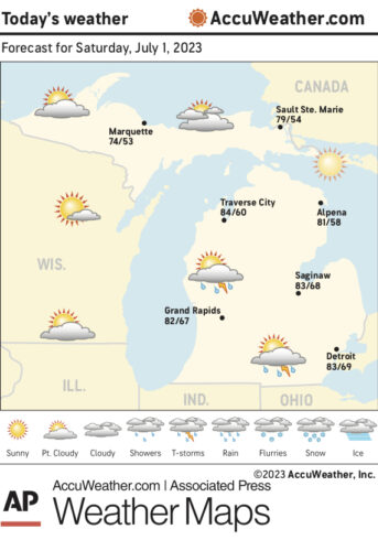 Marquette and vicinity: Today, a 20 percent chance of showers after 1 p.m. Mostly sunny, with a high near 77. West wind 5 to 10 mph becoming north in the afternoon.