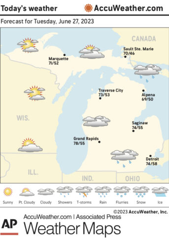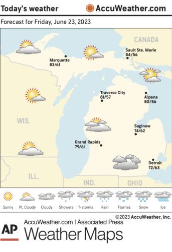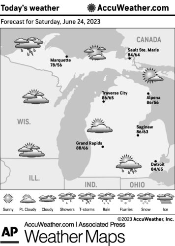 Marquette and vicinity: Today, sunny, with a high near 87. Southwest wind around 5 mph becoming southeast in the afternoon. Tonight, mostly clear, with a low around 61. South wind around 5 mph.