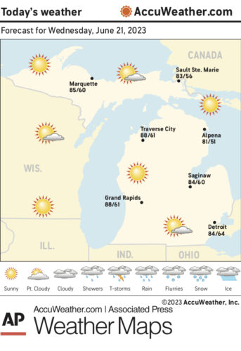 Marquette and vicinity: Today, sunny, with a high near 84. South wind 5 to 10 mph. Tonight, mostly clear, with a low around 61. South wind 5 to 10 mph.