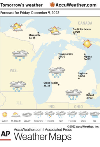 Marquette and vicinity: Today, mostly cloudy, with a high near 34. Northwest wind around 5 mph becoming southeast in the afternoon.
