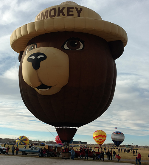 How impressive? The balloon — known as a “special shape” because of its unique contours — holds 145,000 cubic feet of hot air; Is 97 feet tall, including the basket; measures 72 feet across at Smokey’s hat brim; Is made of 4,670 square yards of nylon; and takes 12 to 15 people for setup and inflating.
