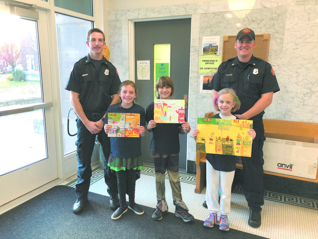 The Fire Prevention Month poster winners have been announced. The grand prize winners from each school received a ride to school on the fire truck and all contest winners receive a T-shirt and their pictures in the paper. Pictured from left, firefighter Pete Windsor, grand prize winner Dylan Hill, second grader Ellia Marquardson, fourth grader Larkyn Stucko, and engineer Dustin Hennessy.