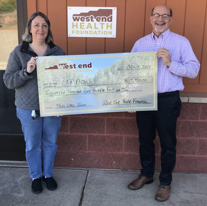 Upper Peninsula Diabetes Outreach Network (UPDON) Executive Director Kristen Cambensy accepts a check for $17,950 from Douglas Russell, Foundation Manager for the West End Health Foundation, from the 2021 Swim Teal Lake “Benefit for Diabetes.” The foundation matches all monies collected from sponsorships, donations, swimmer pledges, and entry fees and returns all funds collected to UPDON. These monies will help UPDON continue their mission of providing outreach services across the Upper Peninsula for families and individuals living with diabetes.