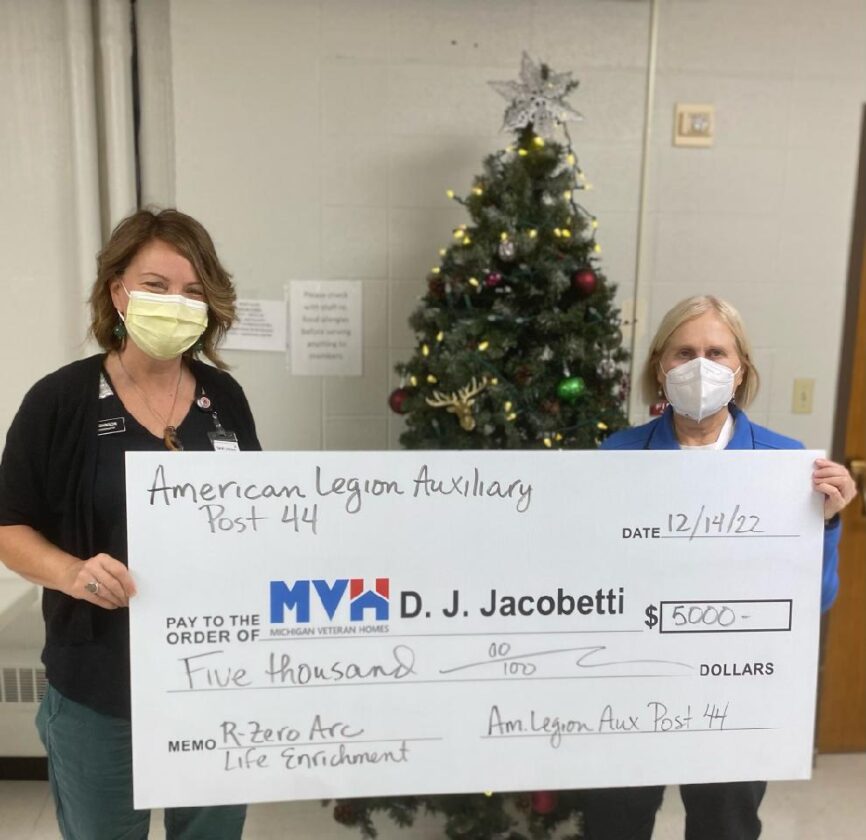 American Legion Auxiliary Unit 44 President Linda Kaare, right, presents a check for $5,000 to Sarah Johnson, Volunteer Coordinator for the D.J. Jacobetti Home for Veterans in Marquette, to aid in obtaining a R-Zero Arc unit for their facility. Sarah was the guest speaker at the last auxiliary meeting and introduced members to the benefits this unit would bring to the veterans environment.