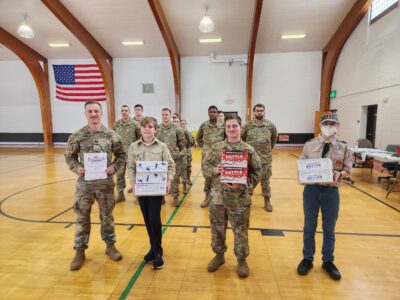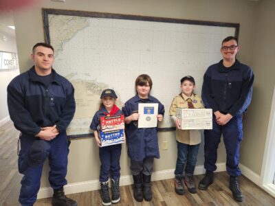 When Scouts sell popcorn in the fall, customers are given the option to make a donation in lieu of a purchase. The donation is used to provide popcorn to community helpers. This year, members of the Armed Forces are the recipients of the gifts. Some popcorn is shipped throughout the world to service members by the Scout’s supplier, Pecatonica Popcorn. However, Cub Scout Pack 395 and Boy Scout Troop 302 made the donations locally to the Coast Guard and National Guard. Representatives of Scout Troop 302 presented the popcorn to the 107th Engineer Regiment’s Rear Detachment in Marquette. The popcorn will be forwarded to the regiment’s headquarters and elements who will be in Kuwait for a mobilization mission. Pictured above are Detachment Commander Captain Hook, Scout Caleb Rayhorn, Specialist Shelly, an Eagle Scout and past Camp Hiawatha staff member, and Scout Jacob Baumann. Cub Scout Pack 395 made the presentation to Coast Guard Station Marquette. Shown below are MK3 Gallagher, Olivia Ellingson, Ti Moyle, Vynce Lentz, and BM3 Seguin. Information on the programs of the Boy Scouts can be found at https://beascout.scouting.org/.
