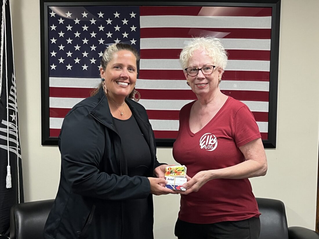 The Marquette Elks Lodge #405 present $1,000 in gas and grocery gift cards to Alameda County Veterans Alliance. The Alliance serves veterans throughout Marquette County. Pictured are Rachel Woody, director of the Veterans Alliance, left, and Elks Exalted Ruler Pam Laurich.