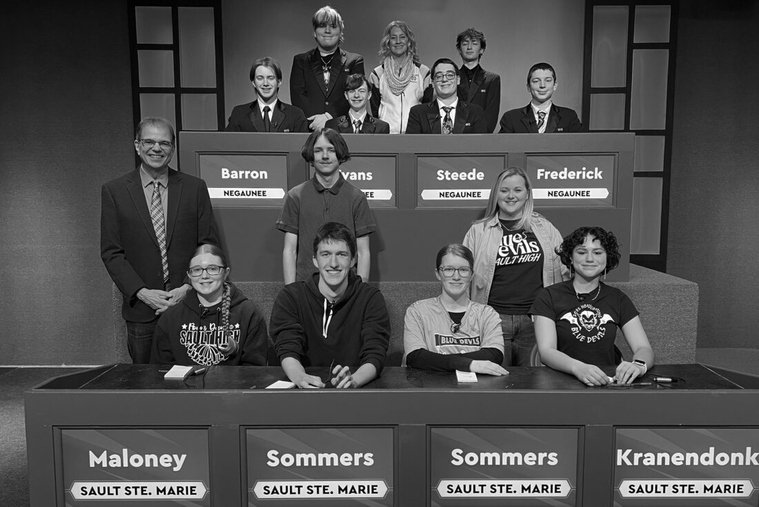 Negaunee played Sault Ste. Marie in High School Bowl and lost by a score of 120-320. Thirty six schools from the Upper Peninsula and Northern Wisconsin compete in WNMU-TV's High School Bowl tournament, now celebrating 47 years on the air. Sault Ste. Marie will advance to the second round when they play Ironwood, scheduled to air on April 4, 2026. Running from November through the championship game in April, the High School Bowl series airs on WNMU-TV Saturdays at 8 pm and Mondays at 3 pm. It is also available statewide on the Michigan Learning Channel. Find more information on the 2025-2026 tournament at wnmutv.nmu.edu. Representing Negaunee, seated from left, are players Lukas Barron, Aiden Evans, team captain Conner Steede and Joshua Frederick. Standing are alternates Mikel Annala and Miles Spaulding with coach Beth Holmgren. Players for Sault Ste. Marie are, seated from left, Lucy Kranendonk, Cora Sommers, team captain Nathaniel Sommers and Eleanor Maloney. Standing are alternates Cullen Carrick and with coach Kim Badenski . High School Bowl host Jim Koski is standing at lower left. (Courtesy photo)