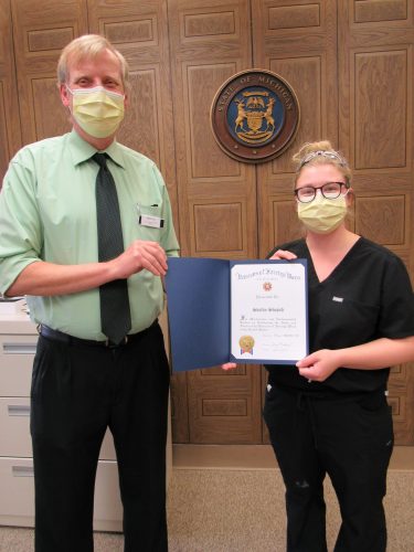 On behalf of V.F.W. Superior Memorial Post 6 of Marquette , Ron Oja, administrator of D.J. Jacobetti Home for Veterans, presented Shelby Shepich, resident care aide, with a V.F.W. certificate of appreciation and a $100 gift. Shelby has worked at the Veterans Home for 3 1/2 years. She is ...