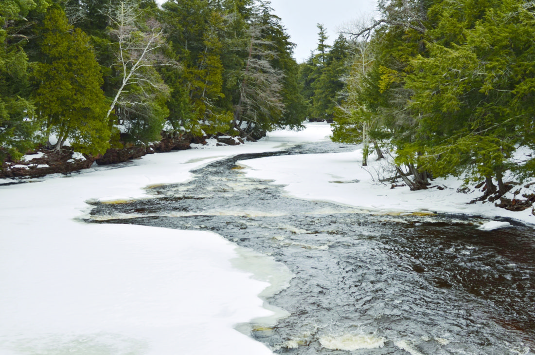 The Presque Isle River flows through a wintry landscape toward its mouth at Lake Superior at Porcupine Mountains Wilderness State Park. Applications now are being sought for the park’s Artist-In-Residence Program. (Photo courtesy of the Michigan Department of Natural Resources)