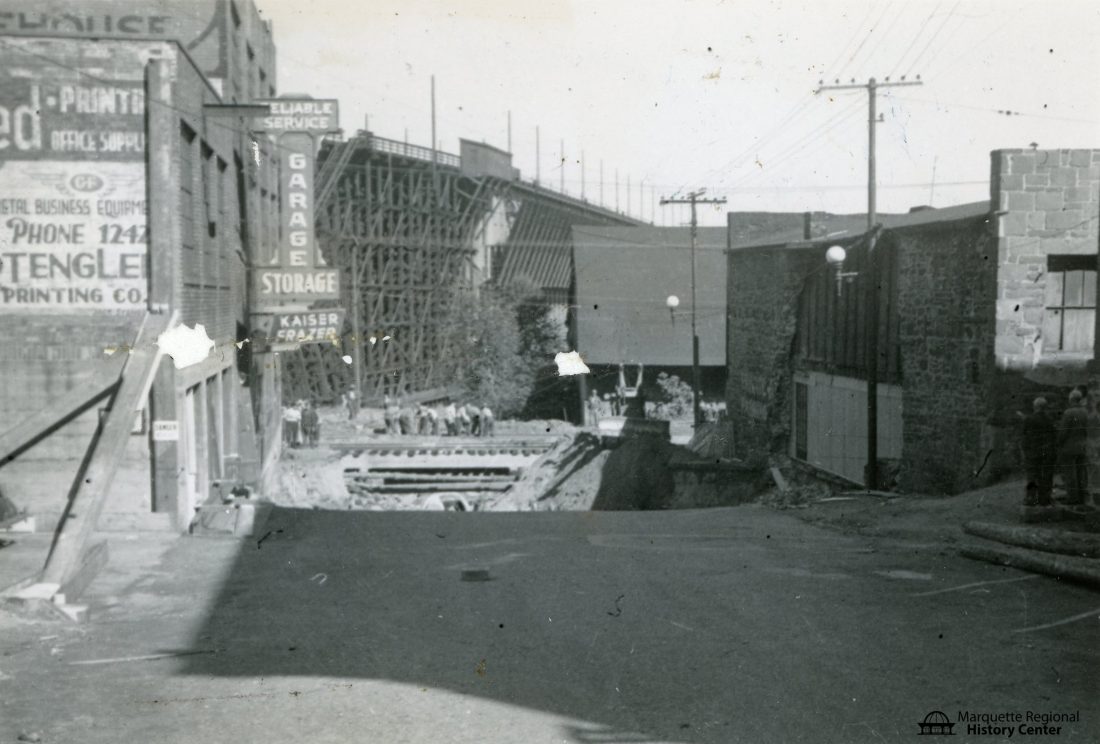 - The damage to the Reliable Service Garage on the north side of Spring Street is shown. Notice the four-inch water main hanging out of the side of the hole. (Photo courtesy of the Marquette Regional History Center)
