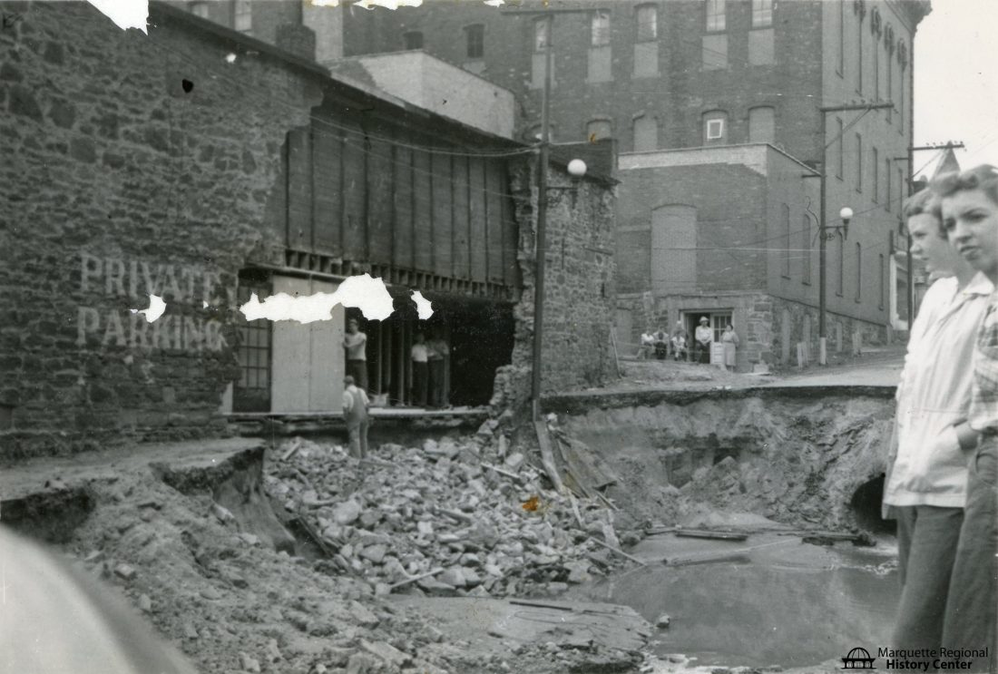 - The collapsed wall of Tonella and Rupp’s Rug Shop is shown on the south side of Spring Street. Notice the old storm sewer behind the women on the right. (Photo courtesy of the Marquette Regional History Center)