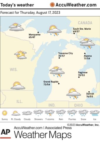 Marquette and vicinity: Today, a 20 percent chance of showers before 10am. Mostly cloudy, with a high near 66. Northwest wind around 10 mph. Tonight, mostly cloudy, with a low around 52. North wind 5 to 10 mph.