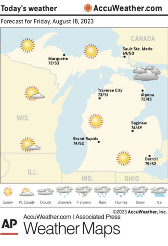 Marquette and vicinity: Today, sunny, with a high near 77. Northwest wind around 5 mph.