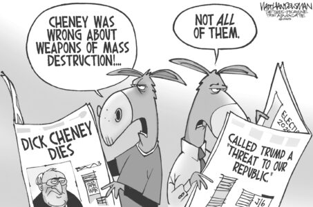 Editorial cartoons — 2 of them For Thrusday, Nov. 6, 2025 NewsletterToday's breaking news and more in your inboxEmail(Required) I'm interested in (please check all that apply)(Required) Daily Newsletter Breaking News Obituaries Are you a paying subscriber to the newspaper?(Required) Yes No Cartoon Commentary Editorial cartoons — 2 of them Editorial cartoons — 2 of them Cartoon commentary Cartoon commentary Cartoon commentary Cartoon commentary